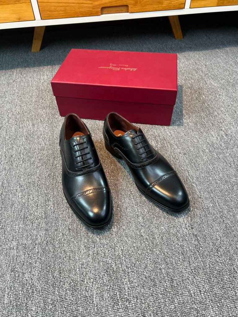 Ferragamo Black Polished Leather Brogue Cap Toe Lace-Up Men Business Wedding Oxford Formal Shoes
