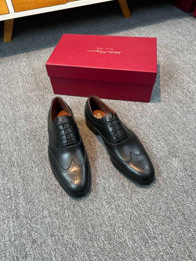 Ferragamo Black Smooth Leather Wingtip Brogue Lace-Up Men Vintage Business Oxford Formal Shoes