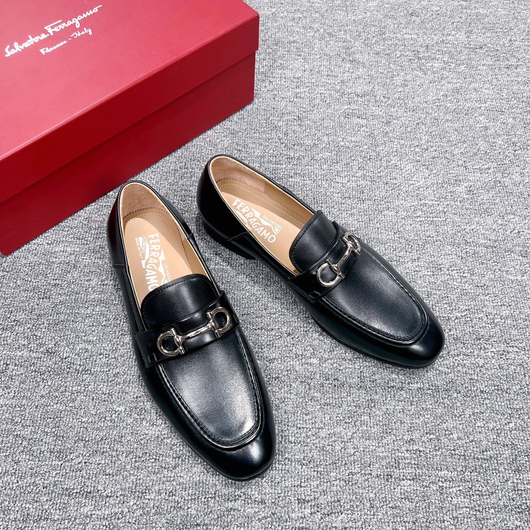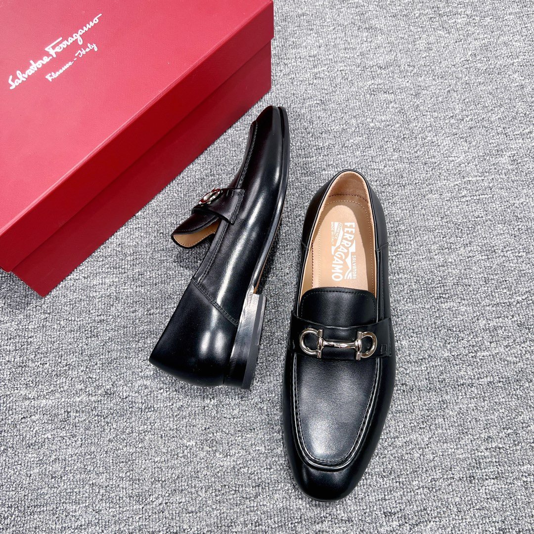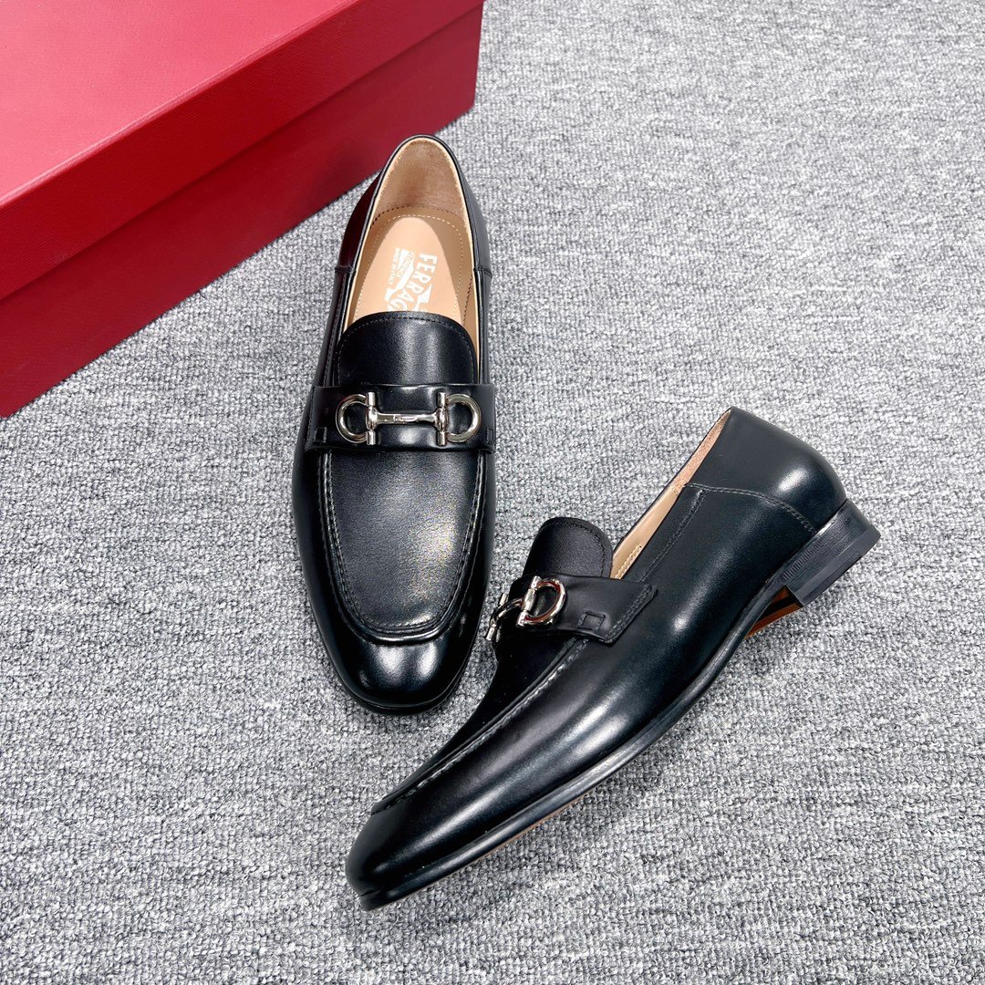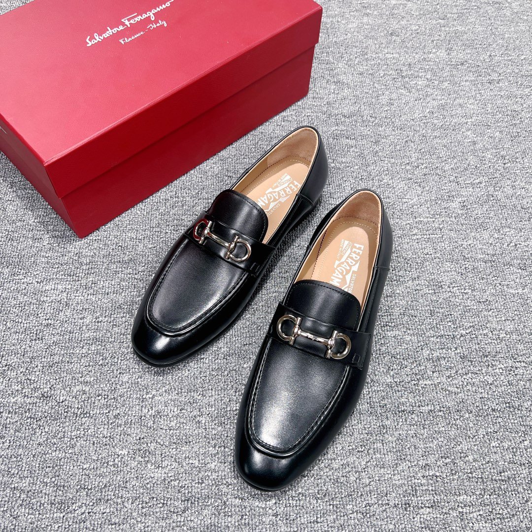 Ferragamo Black Calf Leather Emblem Buckle Men Formal Slip-On Loafer Shoes