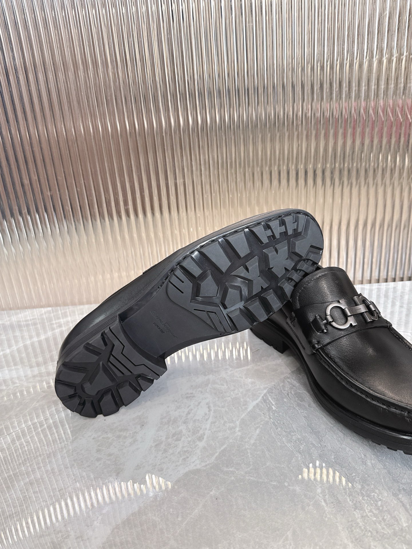 Ferragamo Black Polished Leather Silver Buckle Thick Sole Men Slip-On Loafers