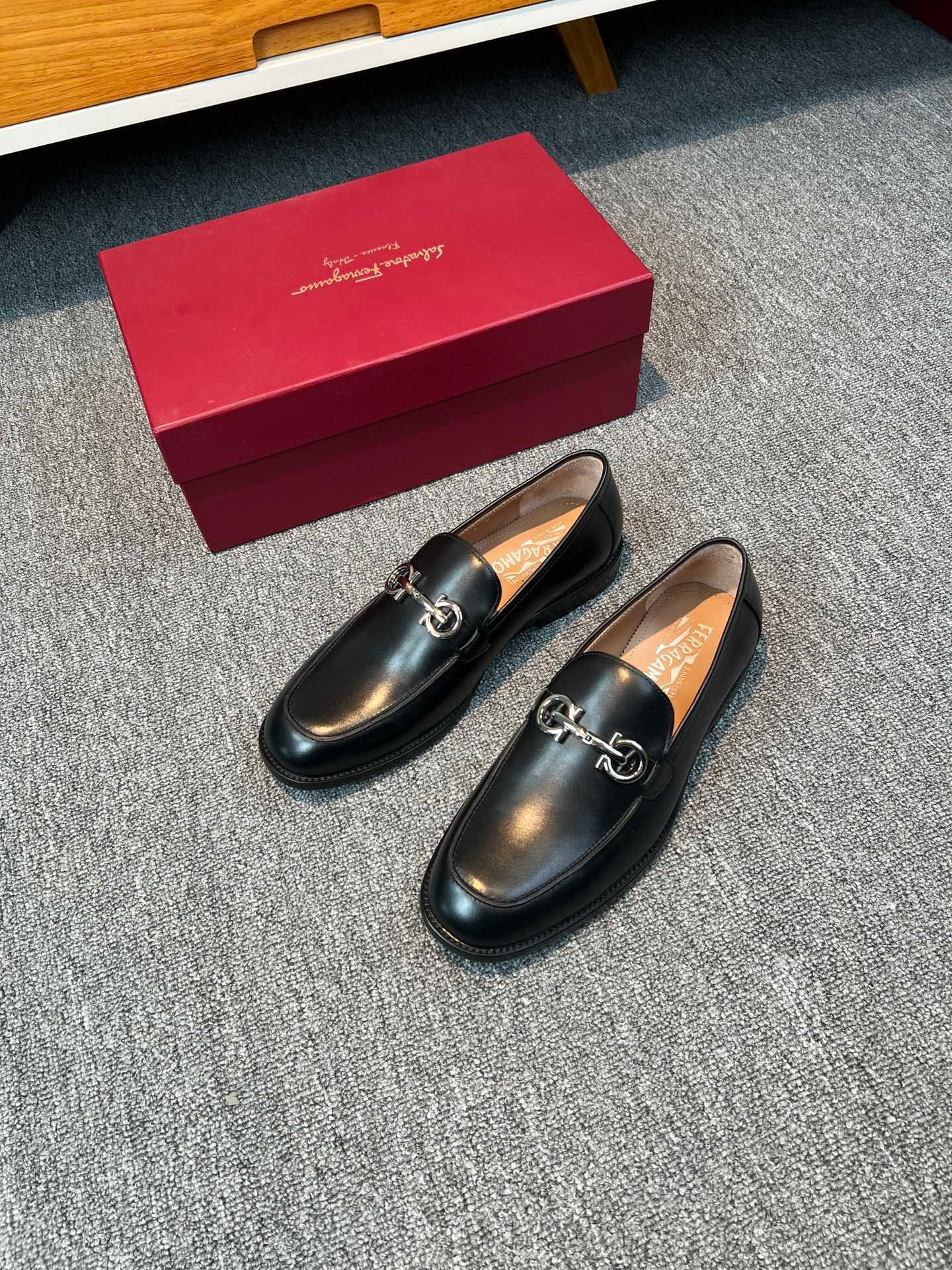 Ferragamo Black Smooth Polished Leather Horsebit Buckle Slip-On Men Luxury Business Formal Loafer Shoes