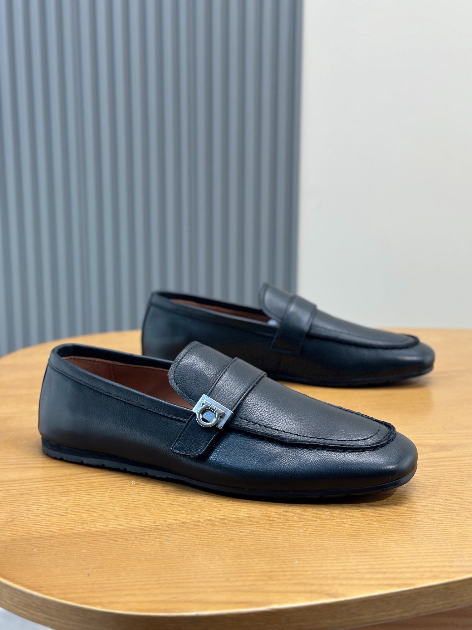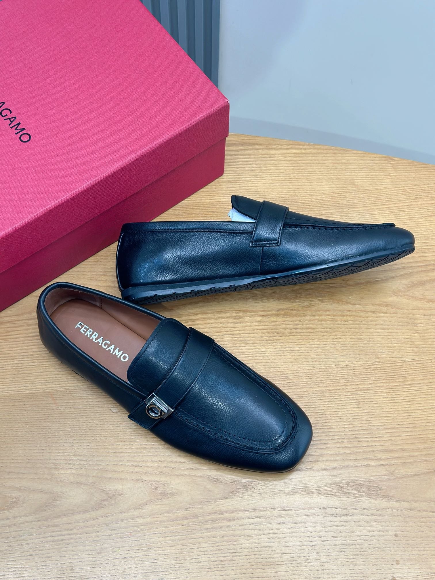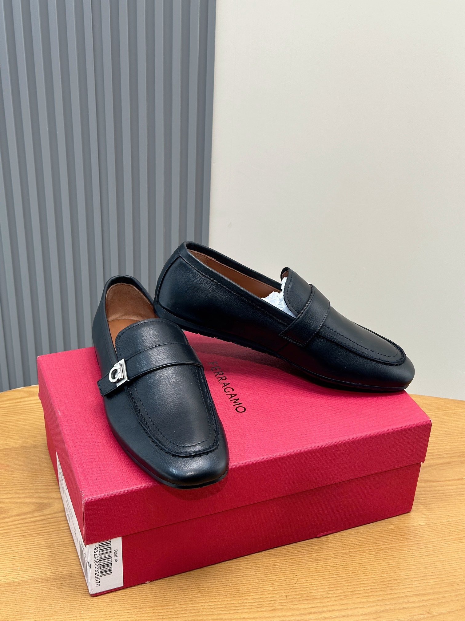 Ferragamo Black Soft Leather Metal Buckle Men Formal Slip-On Loafers