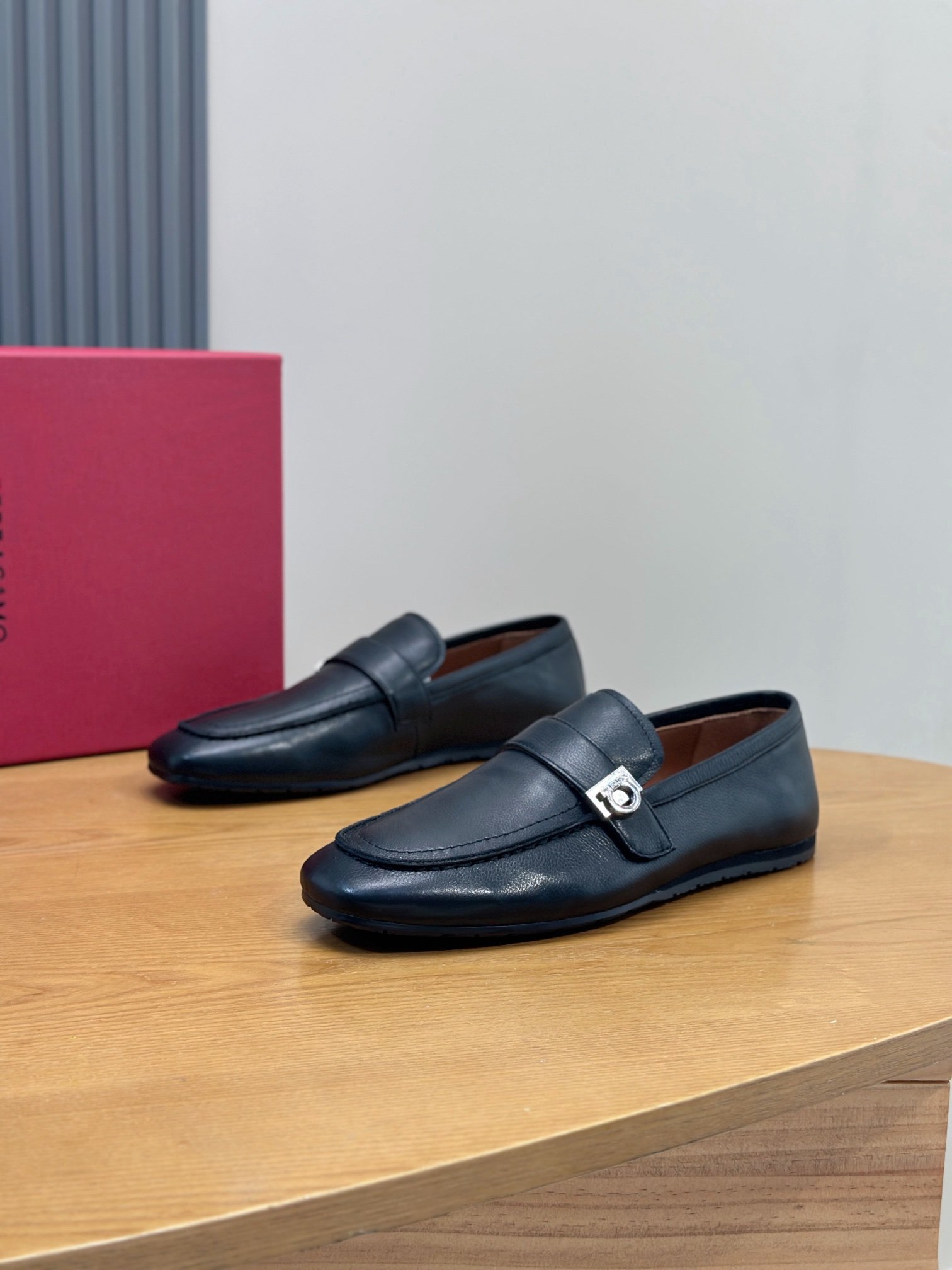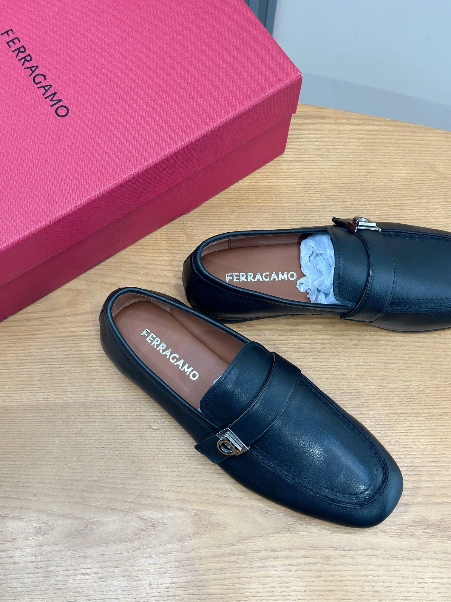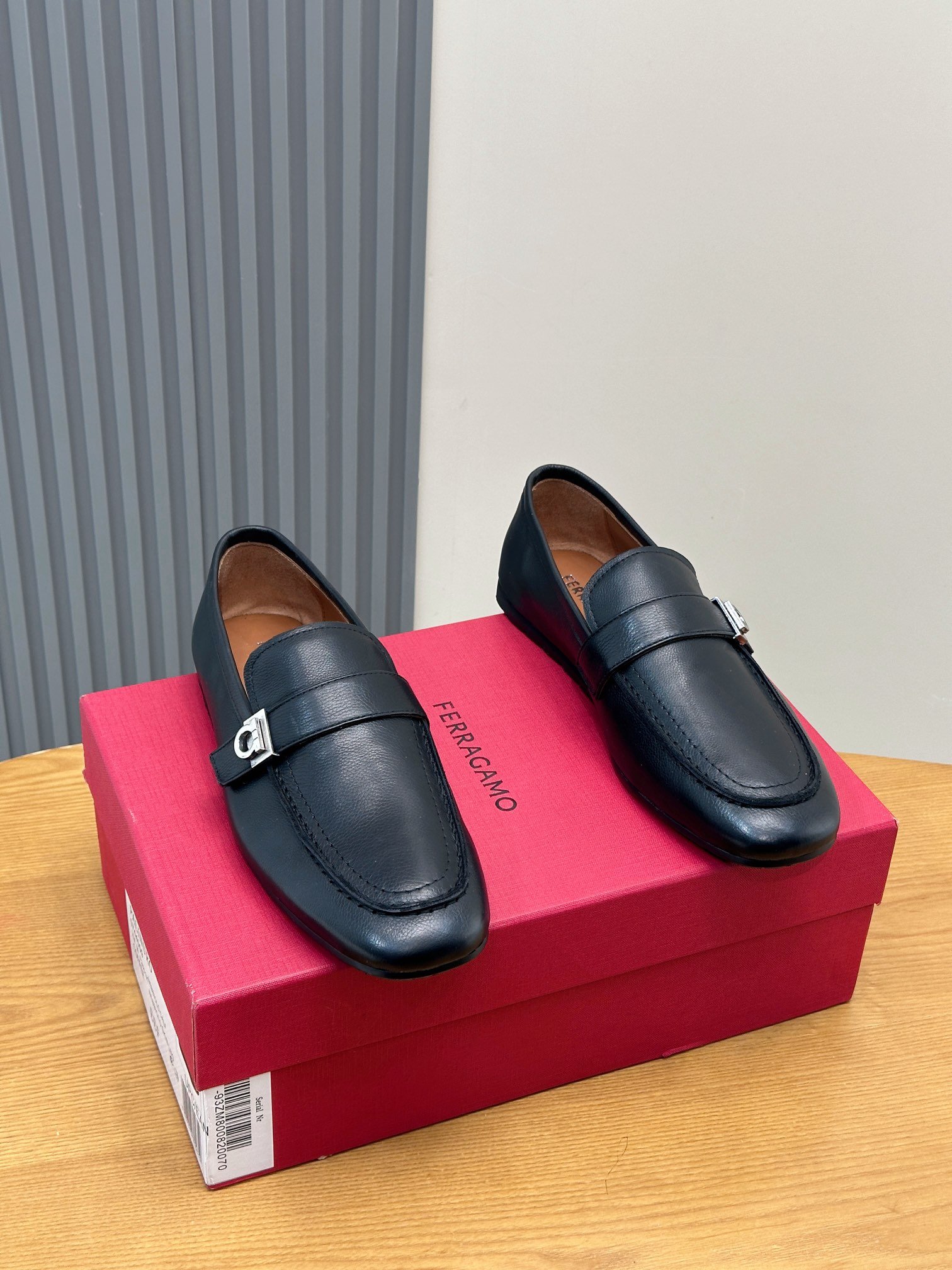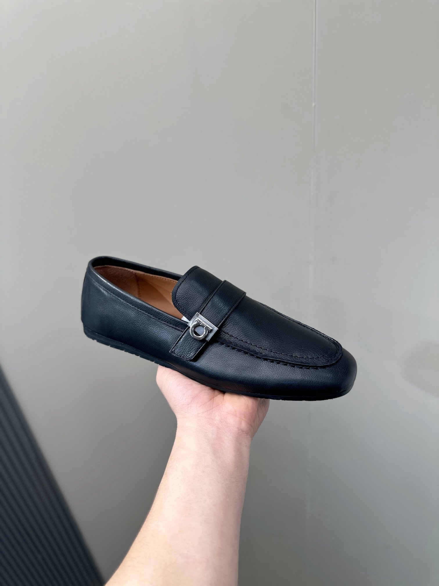 Ferragamo Black Soft Leather Metal Buckle Men Formal Slip-On Loafers