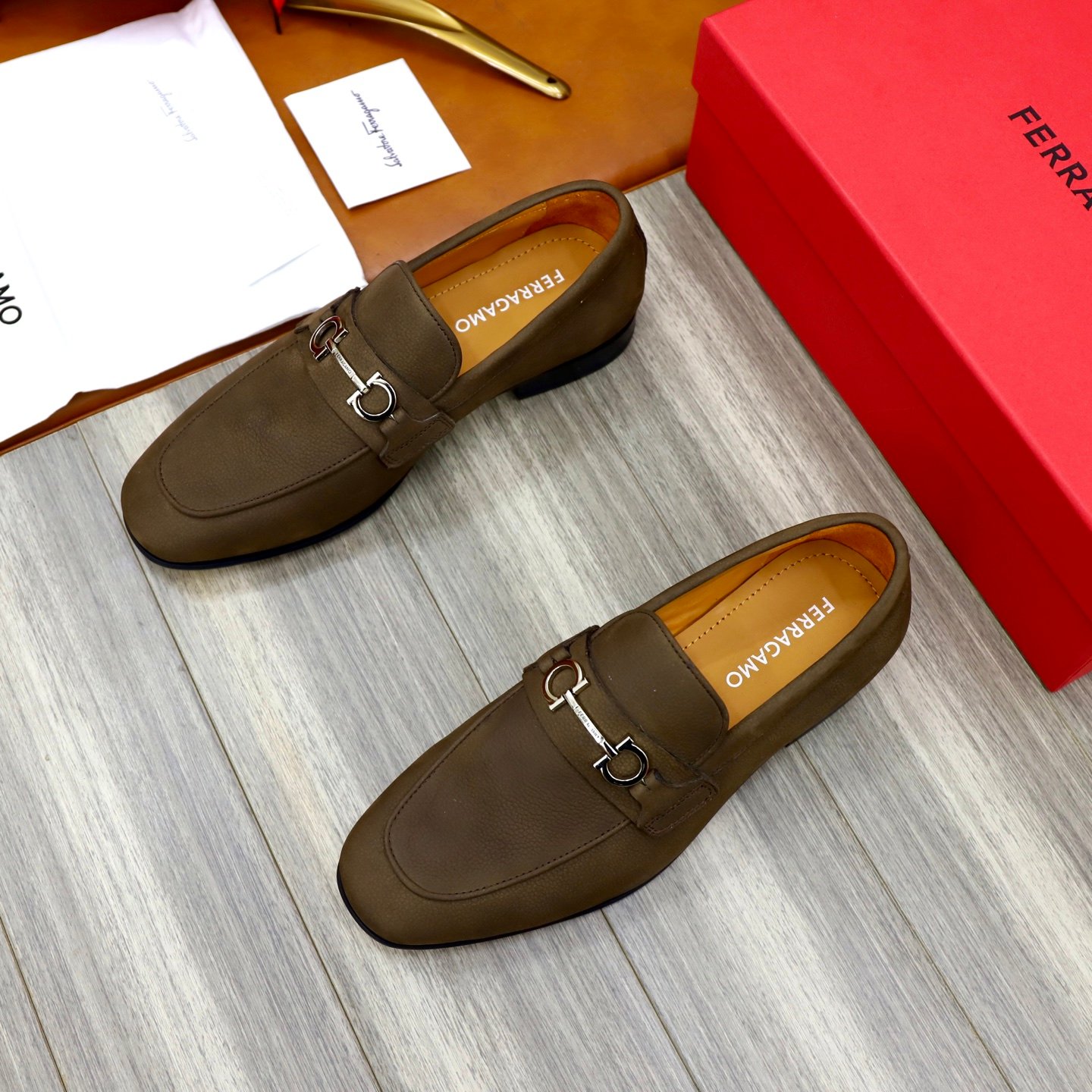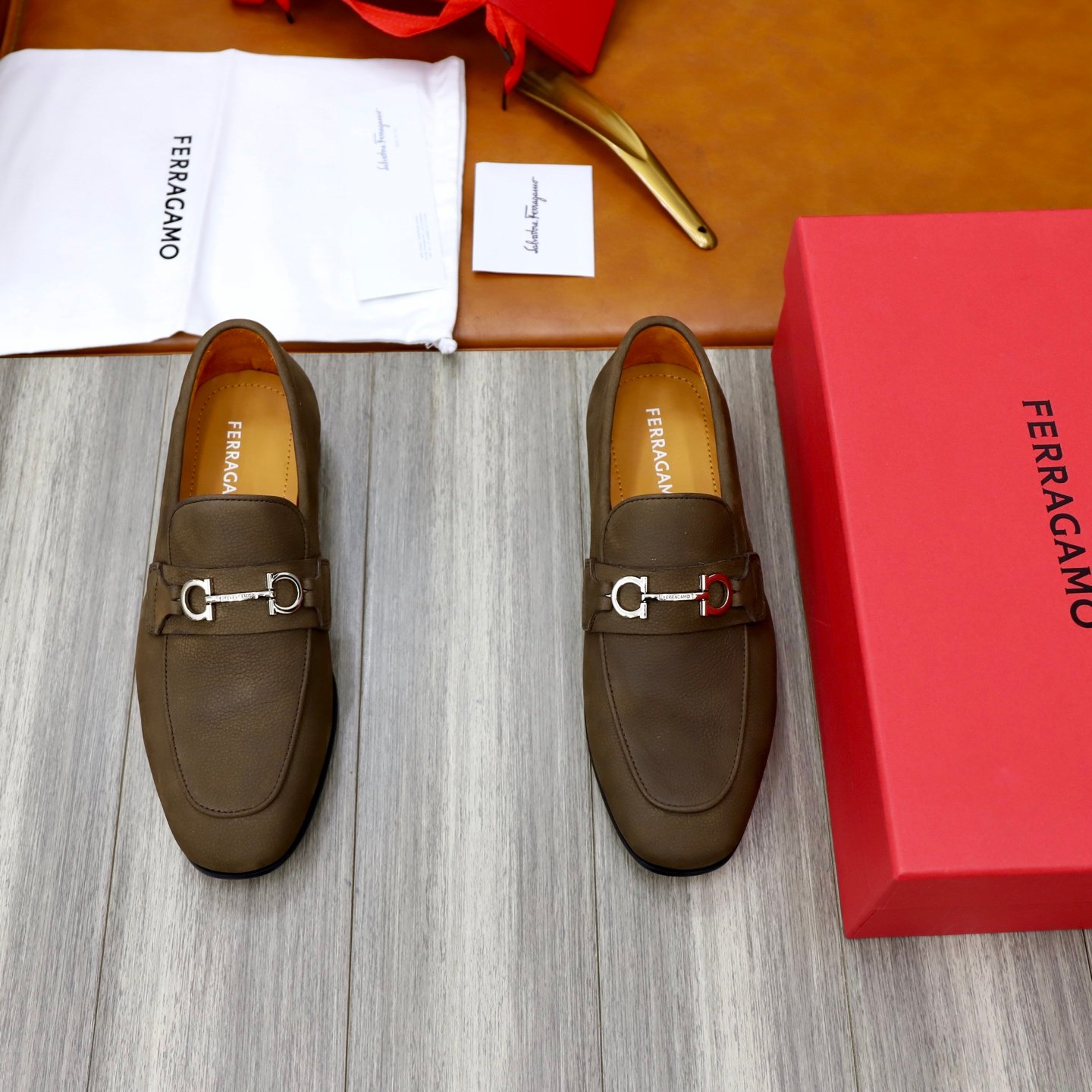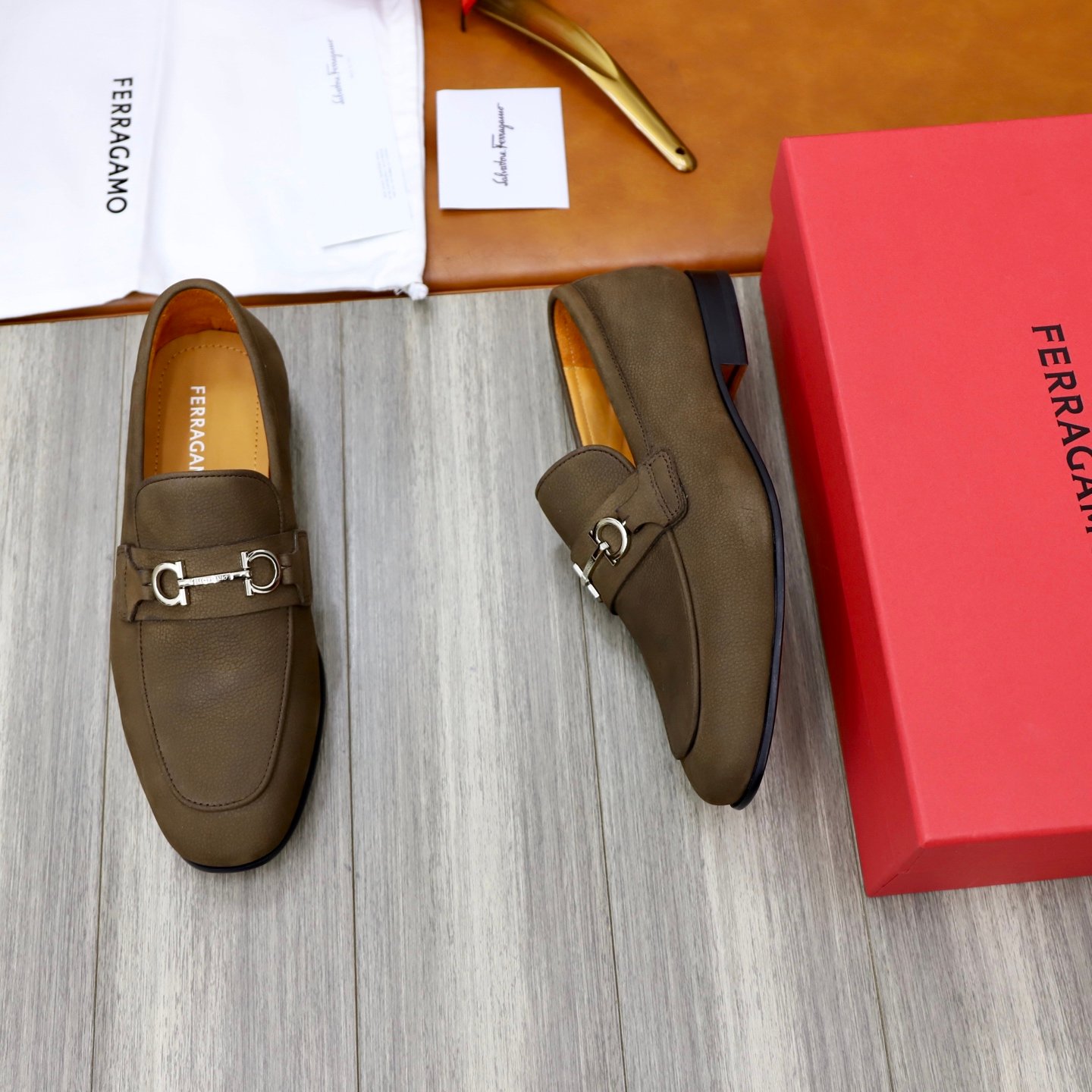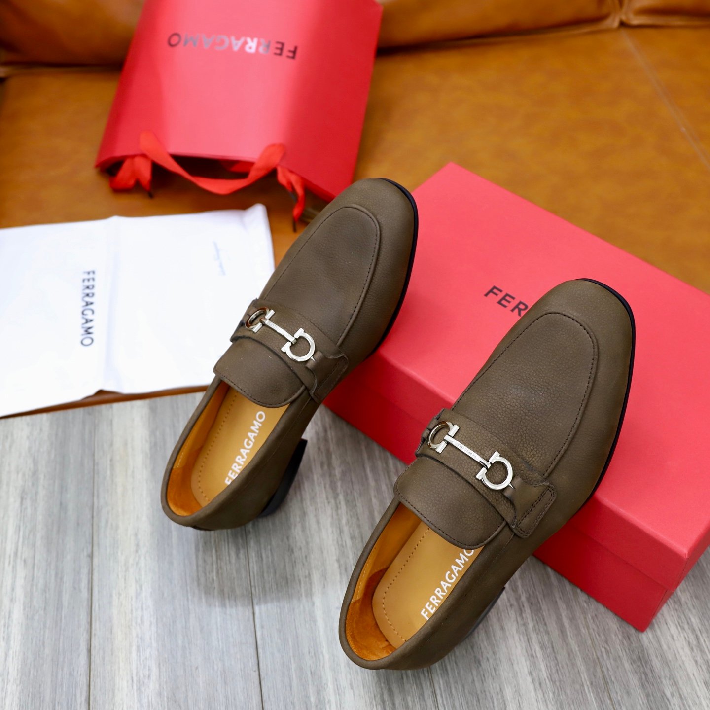 Be the first to review “Ferragamo Olive Brown Pebbled Leather Gancini Men Slip-On Loafers” Cancel reply